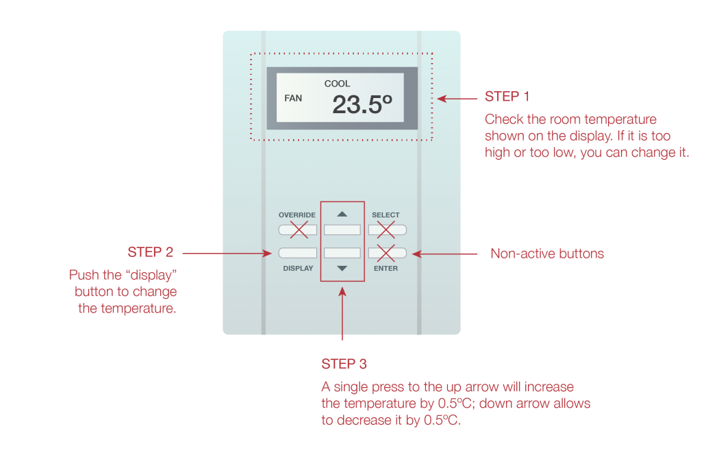 It allows you to increase/decrease the temperature by a maximum of 2°C. If the base temperature in the office is 21°C, then with this panel you can increase it to 23°C or lower it to 19°C.